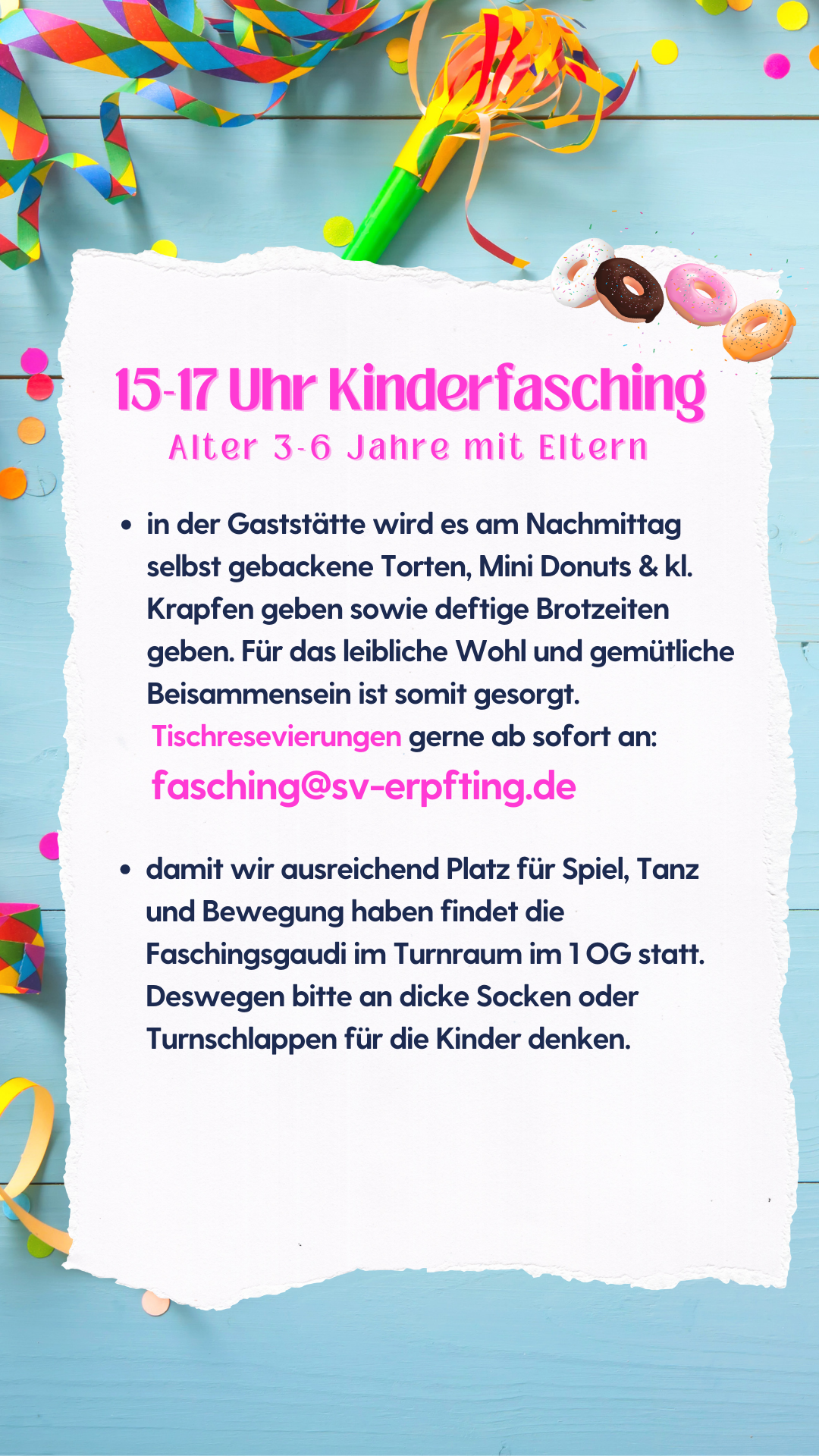 Ein Team aus Faschingsfans 🎊 hat sich wieder zusammengetan, um nochmal eine coole Partysause für die Kids auf die Beine zu stellen: Kinder im Alter von 3-6 Jahren 👑 können gemeinsam 🤗 mit ihren Eltern 👩👧👦👨👧👧 Fasching im Vereinsheim erleben! Dort erwartet sie eine farbenfrohe Welt 🌍 voller Musik 🎶 , Spiel und Spaß 🎉- und natürlich jede Menge lustiger Kostüme🍓👘🧸🐯🦄!
