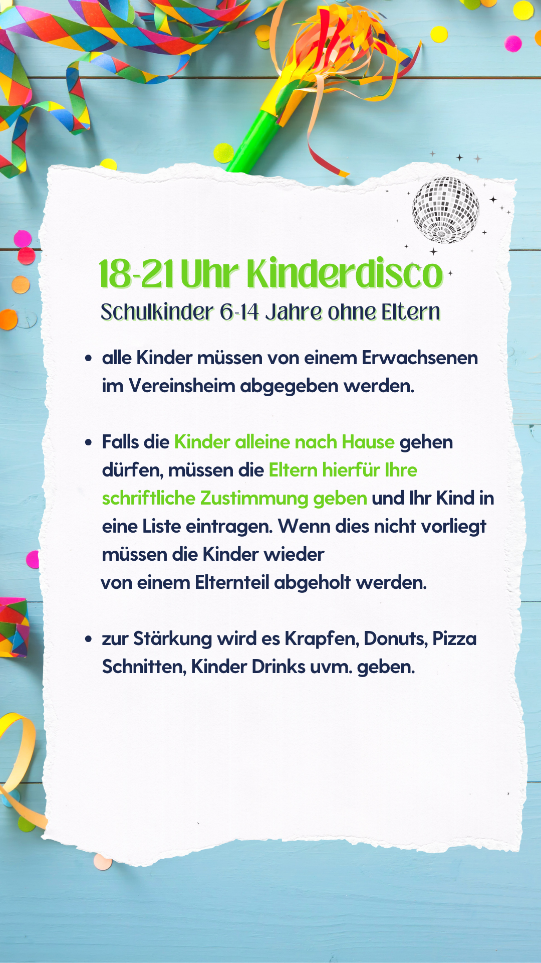 Aber das ist noch längst nicht alles☝🏻! Die älteren Kinder und Jugendlichen von 6-14 Jahren, dürfen sich ab 18 Uhr wieder auf eine eigene Faschingsdisco 🎊🪩 🎊 freuen – ganz ohne Eltern 😉! Hier können sie bis 21 Uhr ausgelassen mit ihren Freunden feiern 💃🏼🕺🏻!Danach können sie wieder von ihren Eltern abgeholt werden 🚙, oder wenn sie eine schriftliche Erlaubnis mitbringen, sogar alleine nach Hause fahren 🛴🚲.
